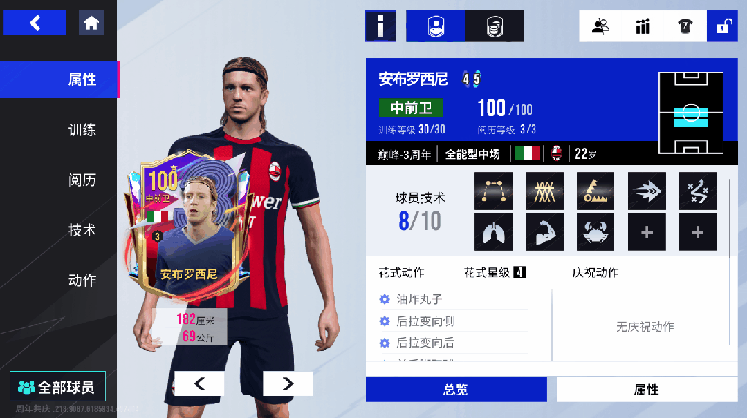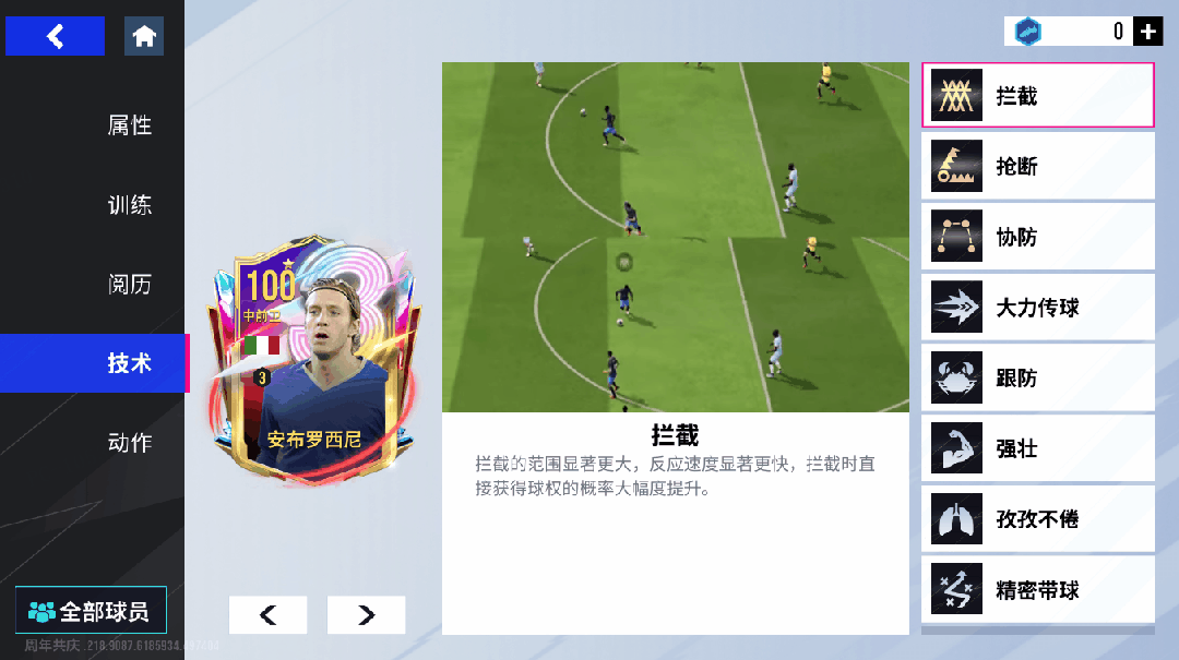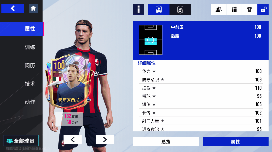 传奇中场100巅峰安布罗西尼是中场战术版图的 “多面手王牌”,他既能胜任中前卫的攻防串联,亦能以后腰身份筑牢防线。防守端的他是名副其实的 “中场铁闸”,110的拦截搭配金色【拦截】技术,拦截能力出众,能高效阻断对手进攻线路,快速夺回球权。107的抢断、106的防守意识搭配金色【抢断】技术和金色【协防】技术以及 108的充沛体力使其防守覆盖贯穿中场纵向轴线,从禁区前沿到中圈弧顶皆能持续输出高强度扫荡,让对手进攻推进屡屡受阻。进攻端的表现同样亮眼:98的控球,叠加 100的灵活,在【精密带球】技术的加持,即便陷入多人围堵,他也能以细腻的盘带闪转腾挪,将皮球牢牢控在脚下;102的加速与98的速度,则构成了高效推进引擎 , 既能持球沿边路撕开防线缺口,也能中路带球完成攻防转换的快速衔接;98的射门与87的远射,让他在禁区弧顶、边路 45 度等区域皆具备直接轰门的威胁,成为中场进攻的 “隐藏得分点”。从防守端的拦截扫荡,到进攻端的持球串联与威胁射门,安布罗西尼以无短板的全能表现,成为战术体系中不可替代的关键支点!