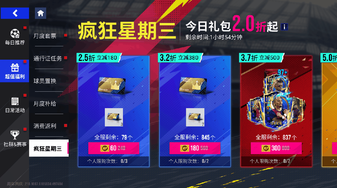 【疯狂星期三】仅在周三12-14时、18-20时与21-23时开启,全服玩家都可参与,活动期间可用超低价购买超值商品,每件商品均有限购数量,售完即止。