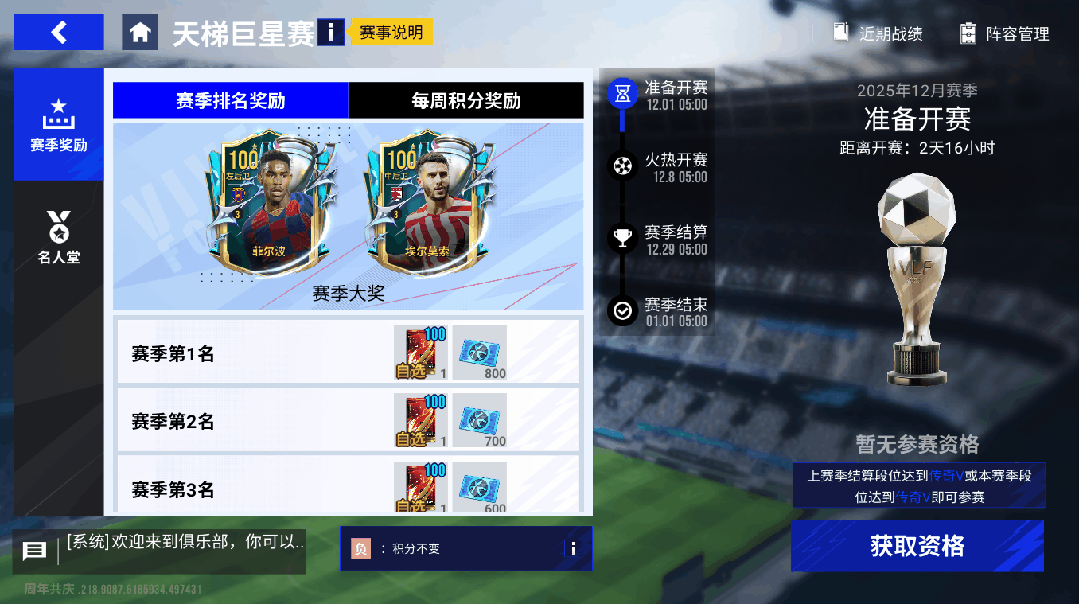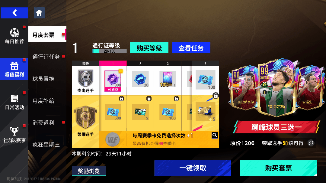 新赛季新奖励,全新套票将于12月1日0时开启,奖励大幅升级,其中包括招募券、球员包等奖励。最终免费大奖可获得98潜力「精选福利自选包」、付费大奖可获得99潜力「巅峰福利自选包」!