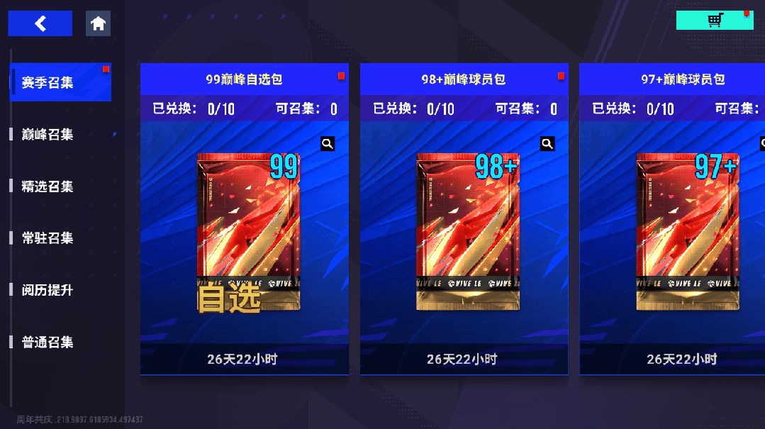 12月1日0时将更换【98+巅峰球员包】、【冠军99巅峰自选包】、【冠军99精选自选包】,更换新的幻金巅峰球员,100巅峰林德洛夫以及100巅峰科奎林。