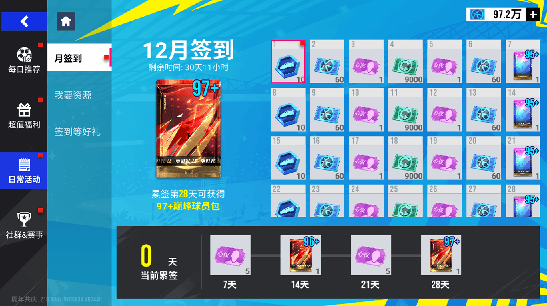 12月1日起,奖励焕新升级,累计签到达指定天数可得【97+巅峰球员包】。