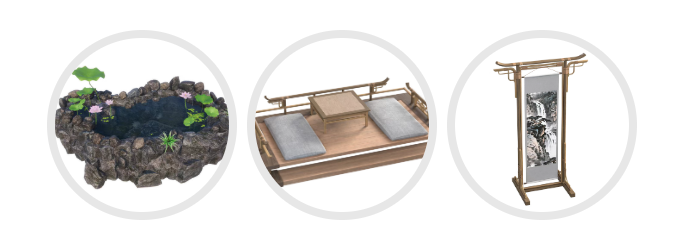 池光如鉴,莲叶田田,池塘中可放入鱼类展示,数尾锦鲤悠游其间,似与观者相乐。轻启院门,便能拥抱治愈秘境,理智与心情,统统回满!