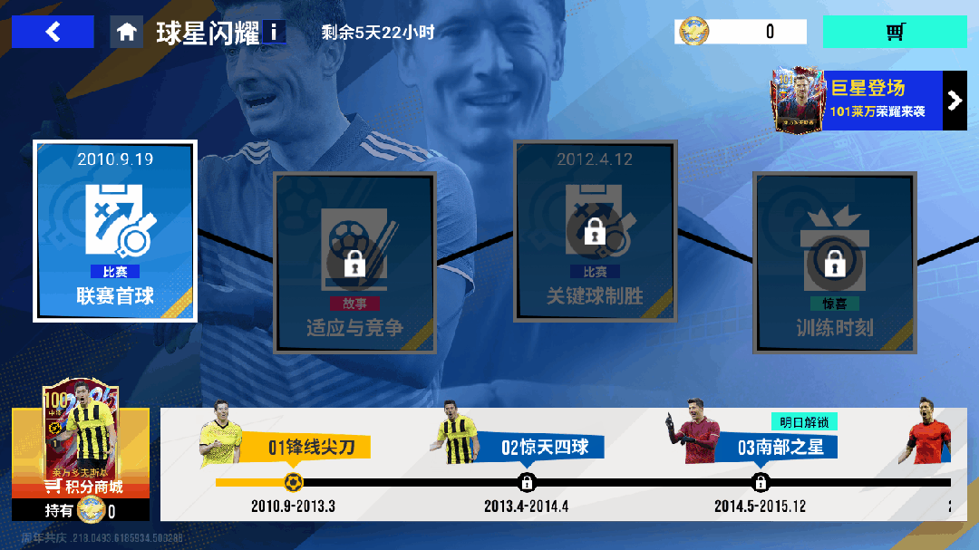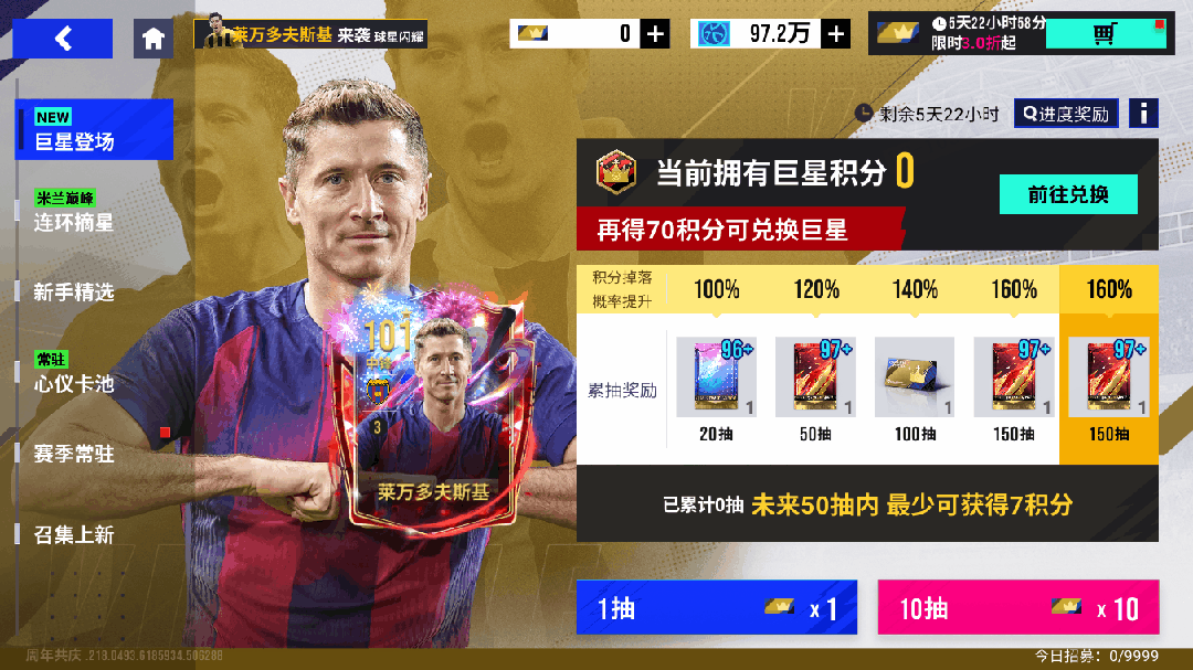 12月5日11时-12月12日11时期间,将开启巨星登场-101巅峰莱万多夫斯基 ,每次开启都有概率获得巨星积分!可通过巨星积分兑换101潜力巅峰球员莱万多夫斯基、99潜力巅峰球员孔德、99潜力精选球员埃里克·加西亚,更可获得进度奖励「96+精选球员包」「97+红蓝军团球星包」「98+红蓝军团球星包」「30%保金精选包」等奖励!