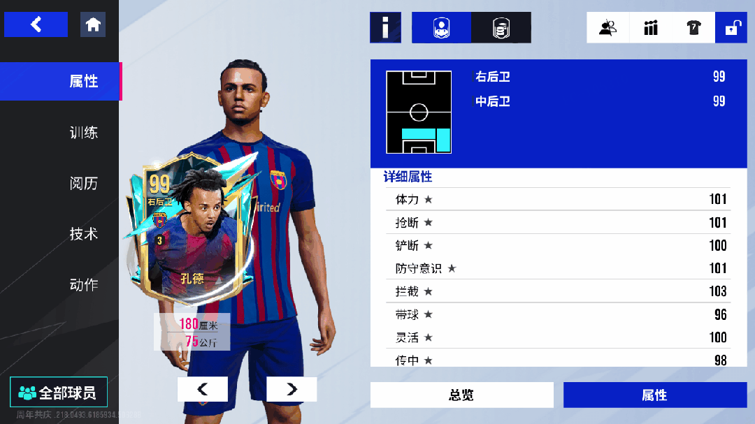 这张99潜力巅峰孔德能够死死黏住对手,金色【拦截】技术,【抢断】【协防】【滑铲】技术极大丰富了孔德的防守武器库,让他能在面对不同类型的对手时都做出最正确的防守选择。既然是铁人,那身体素质方面更是远超常人,【孜孜不倦】技术和【启动】技术,加上达到101的体力和104的双速数据,保障了孔德在全场比赛中都有足够的体力满场飞奔,破坏对手的进攻。