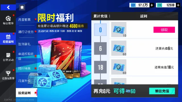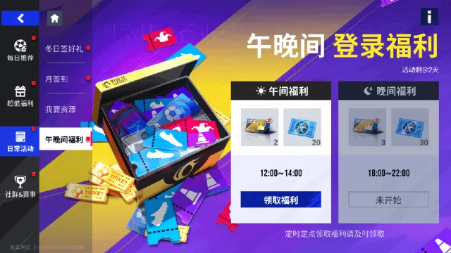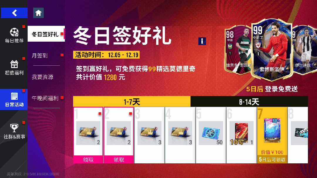 12月5日11时-12月19日11时期间,玩家每日登录点击即可领取大量道具奖励包括「登场券(限时)」、「转盘抽奖券(限时)」、「蓝券」、「98+精选球员包」、「97+巅峰球员包」、「99精选莫德里奇」等。