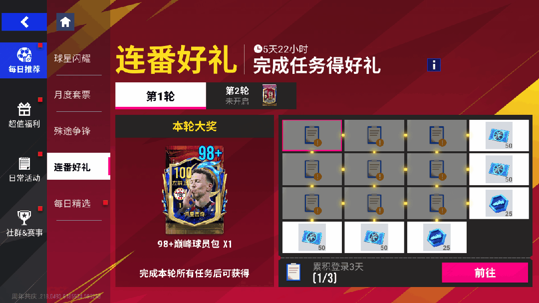 全新活动【连番好礼】惊喜来袭!12月5日11时-12月19日11时,玩家通过完成指定任务进行连线,完成横、竖连线可获得「蓝券」、「技术卡」奖励,规定时间内完成所有任务可获得「98+巅峰球员包」、「99精选贝林厄姆」大奖!