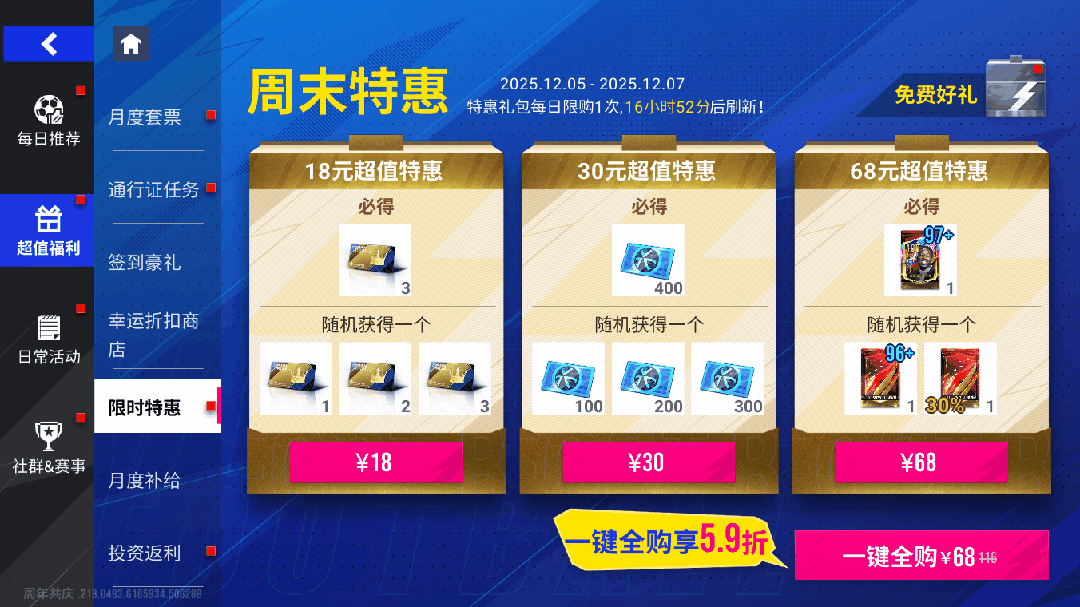 12月5日11时-12月7日期间,【周末特惠】惊喜上线!每日登录可以以优惠的价格购买「97+巅峰球员包」「登场券」等特惠商品,一次性打包购买更可享超值折扣!