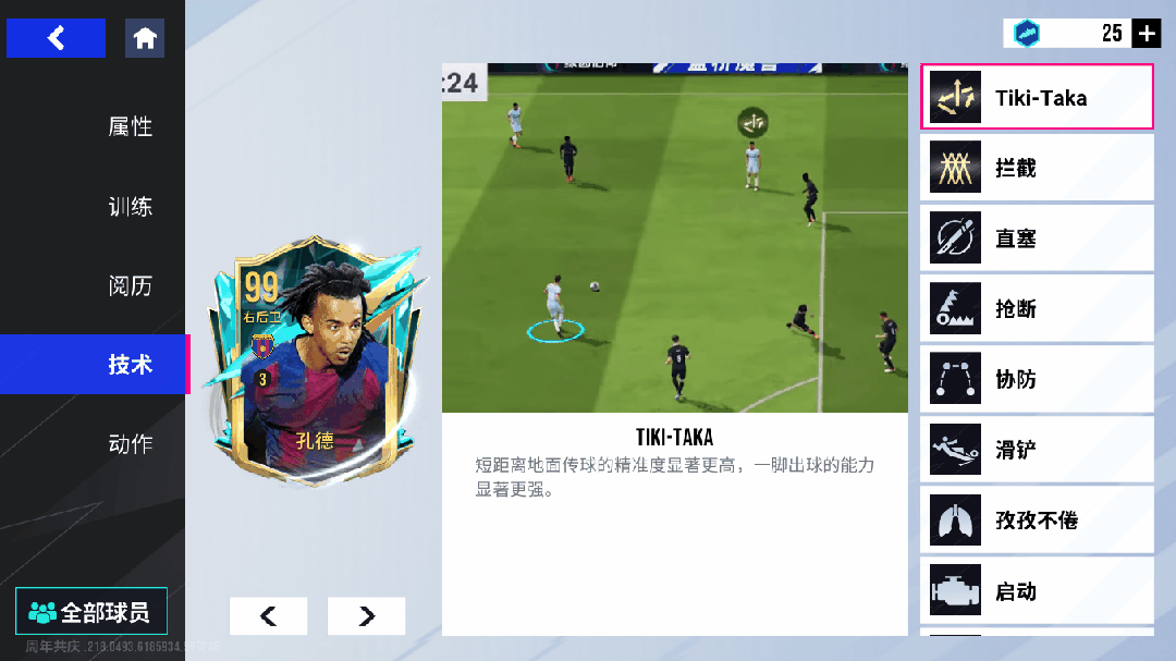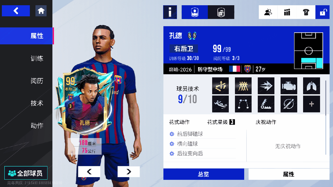 而作为红蓝军团的绝对主力,孔德自然也有一脚出色的传球技术,自带的金色【Tiki-Taka】技术和【直塞】技术就是最好的写照,拥有103短传的他也具有了攻守转换中一脚打穿对手防线的能力,他不仅是球队最坚固的中场盾牌,更是一个永不断电的中场发动机!