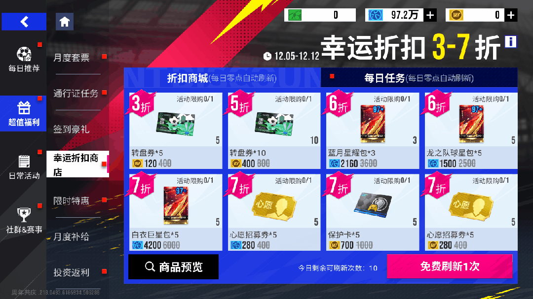 12月5日11时-12月12日11时期间,【幸运折扣商店】全新改版,刷新券可以同时刷新商品种类和折扣,最低可至3折,玩家可以通过完成任务获得刷新券,可购买【意大利巨星包】、【白衣巨星包】、【蓝月星耀包】、【利物浦红球星包】等奖励!