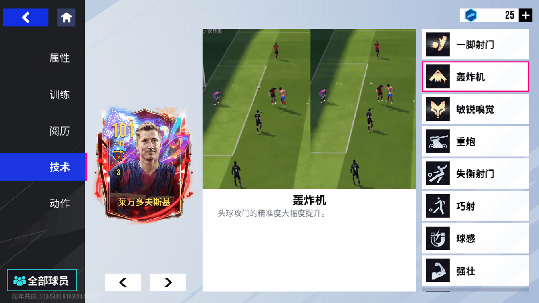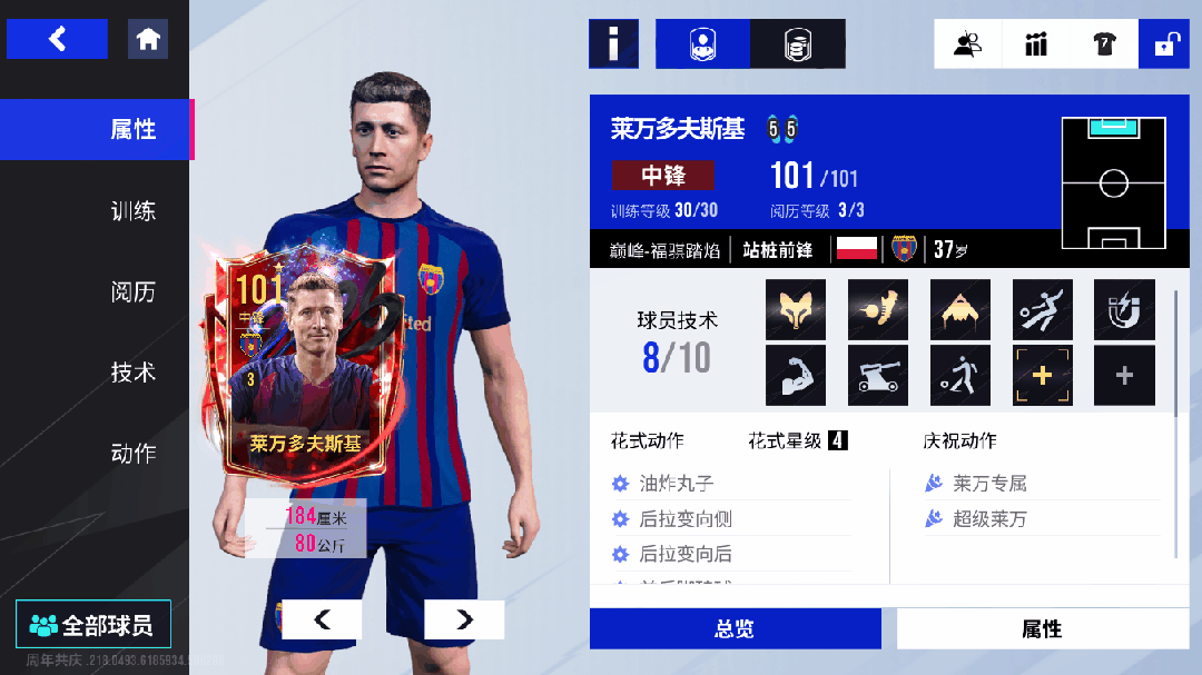 莱万多夫斯基足坛顶尖的中锋,拥有全面且强大的终结能力。这张101潜力值的莱万,将 “全能中锋” 的特质展现得淋漓尽致。106控球与106 带球,让他在禁区内拿球时十分稳健,能巧妙周旋于防守球员之间;金色【一脚射门】技术加持下,他接球即射的效率拉满,112射门、107远射、110 射门力量搭配【重炮】技术,远射如炮弹直轰球门死角;【巧射】技术又让他的射门多了灵巧变化,近距搓射、推射同样精准致命。110进攻意识搭配金色【敏锐嗅觉】技术让他总能精准捕捉到破门良机,像猎手般出现在最具威胁的位置。此外,109强壮保证他在与后卫的对抗中不落下风,111头球加上金色【轰炸机】技术也让他具备强大的高空作业能力,能轻松完成头球攻门或摆渡。全面的能力让他成为禁区内令任何对手防线都胆寒的 “进球机器”!
