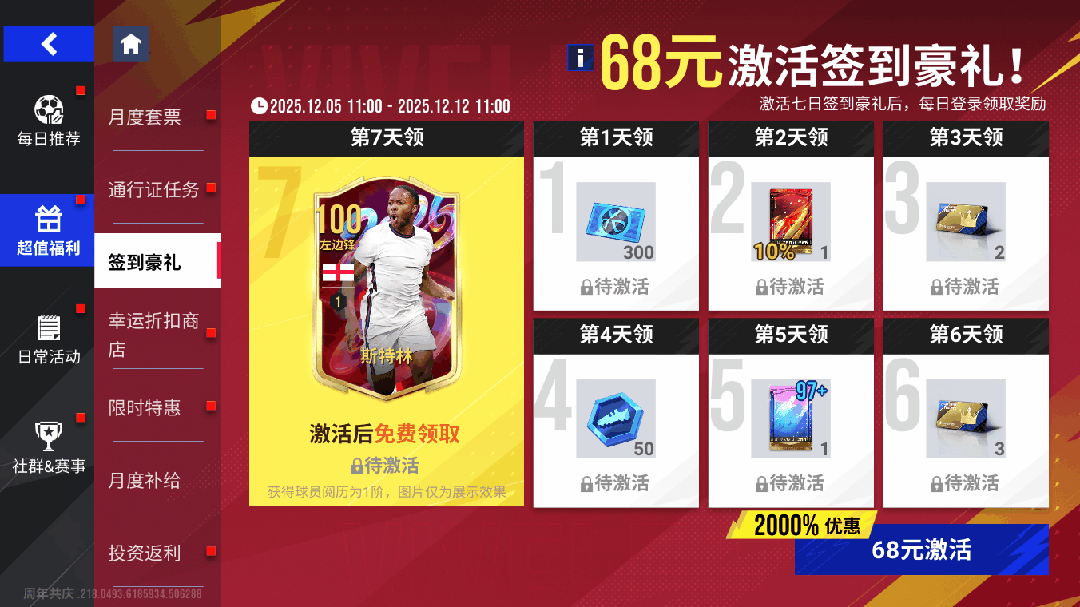 12月5日11时-12月12日11时期间,玩家付费68元可激活活动,激活后每日签到可领取稀有奖励,最高可领取100精选斯特林。