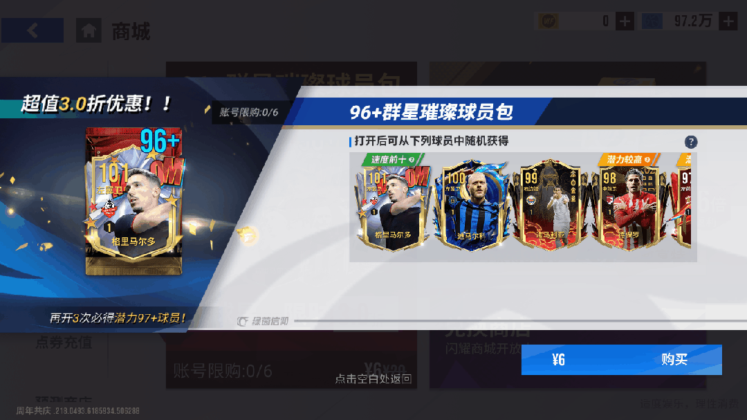 12月5日11时-12月12日11时期间,可在商场购买【96+群星璀璨球员包】,账号限购6次。打开后可获得96-101潜力球员,打开3次必出97+,更有机会获得【101巅峰格里马尔多】!