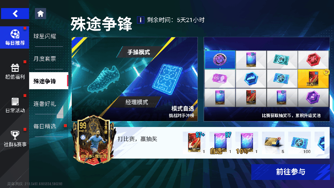 【殊途争锋】12月5日11时-12月12日11时震撼来袭!在手操模式和经理模式中选择其中一种,不同模式,不同奖励!模式选定后,本次活动期间内即不可再次改变,慎重选择!选中模式后参与比赛赢取积分和抽奖币,可进行抽奖获取丰厚奖励,更可凭借最高积分的十场常规赛+五场挑战赛的总积分进行本模式排名,有机会赢取101巅峰球员、心愿招募券等豪华奖励。