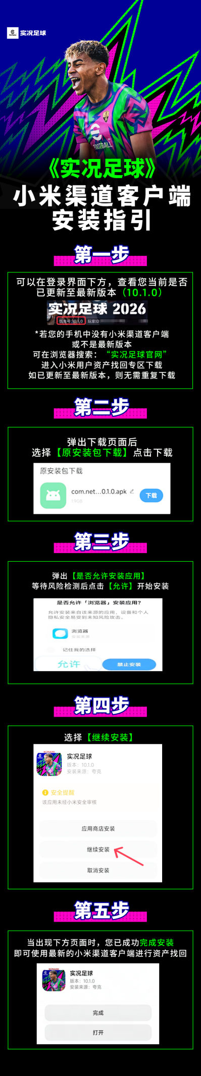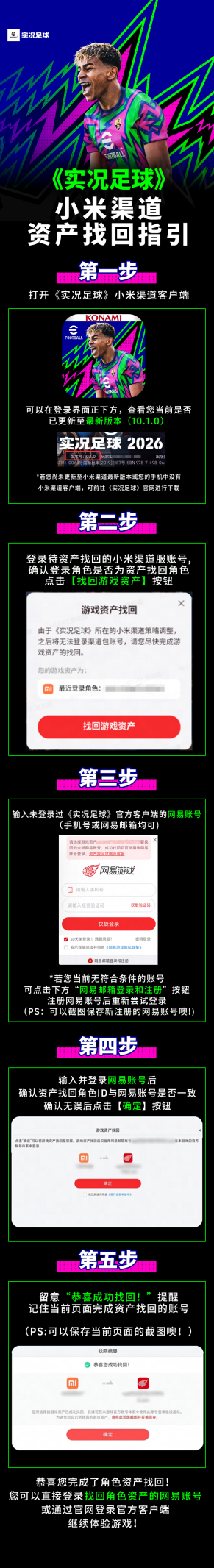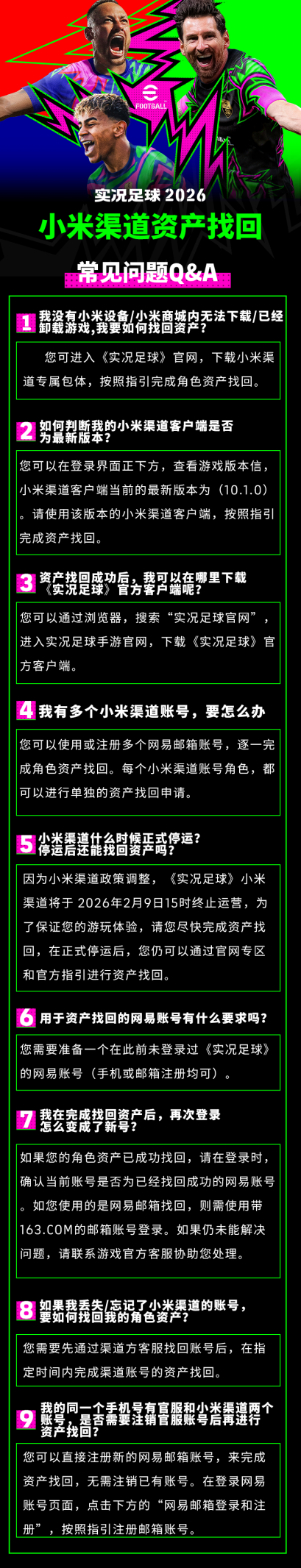 感谢您一直以来给予《实况足球》小米渠道版本手机游戏的支持与厚爱!《实况足球》小米渠道版本手机游戏将于2025年12月8日10时停止部分游玩功能、游戏充值及新用户注册,并同时开启小米角色资产找回服务,现将相关事项通知如下: