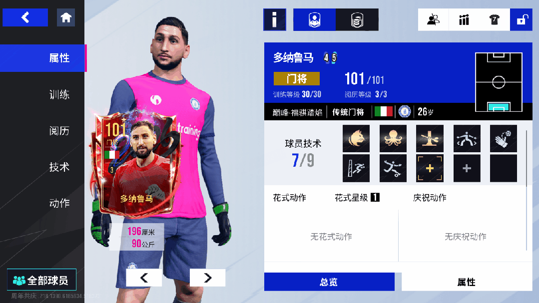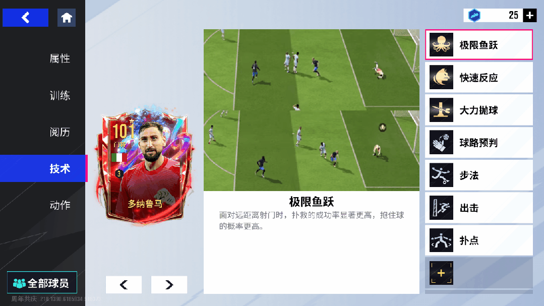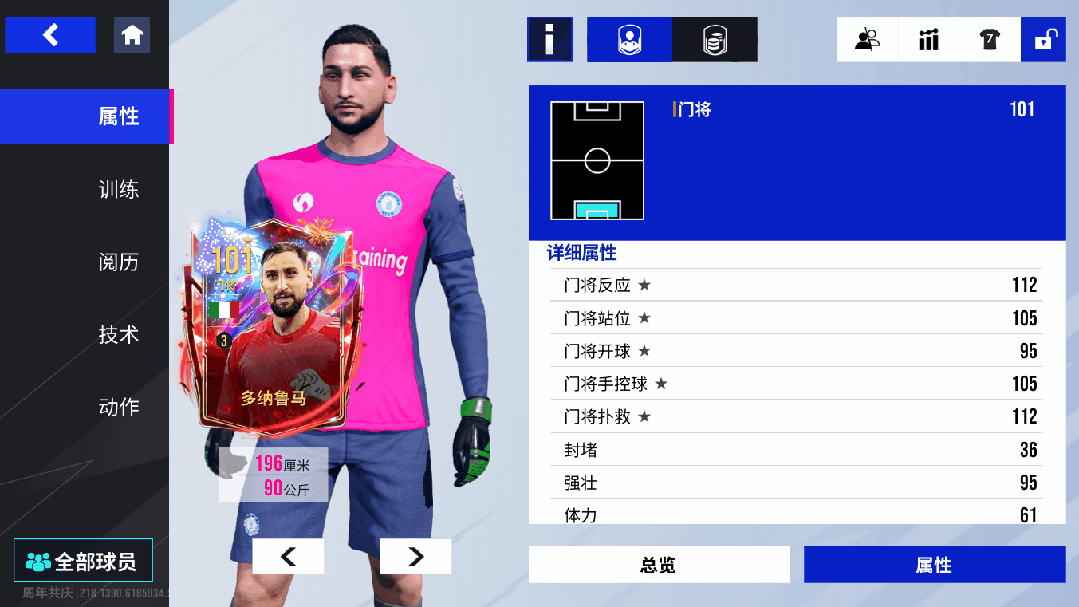 多纳鲁马作为一个身形高大的门将,但他的下地速度和柔韧性却相当出色,这让他能从容化解对手的百般射门,铸就了不可逾越的“叹息之墙” !112的门将反应和112的门将扑救,搭配金色【极限鱼跃】技术和金色【快速反应】技术,无论是跃起化解对手的远射发难,还是在电光火石之间封堵住对手刁钻的近距离射门,多纳鲁马都有十足的把握!不仅如此,105的门将站位搭配【球路预判】【步法】【出击】技术也让他总能出现在最正确的位置,将威胁消弭于无形!除了优秀的门前技术外,多纳鲁马的出球也非常值得信赖,95的门将开球辅以金色【大力抛球】技术,能让他在完成扑救后迅速发起找到队友,发起凌厉反击!