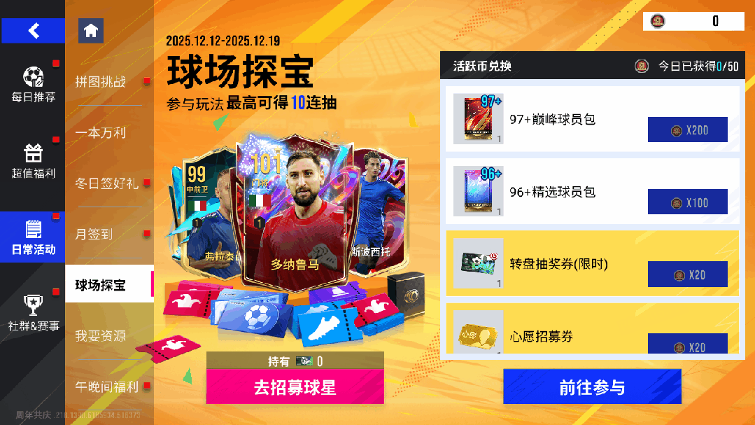 12月12日11时-12月19日11时期间,参与活跃活动获得代币,兑换「转盘抽奖券(限时)」、「97+巅峰球员包」等好礼!