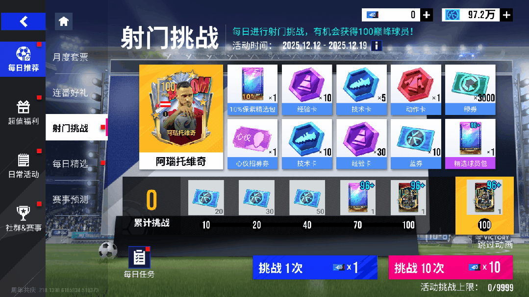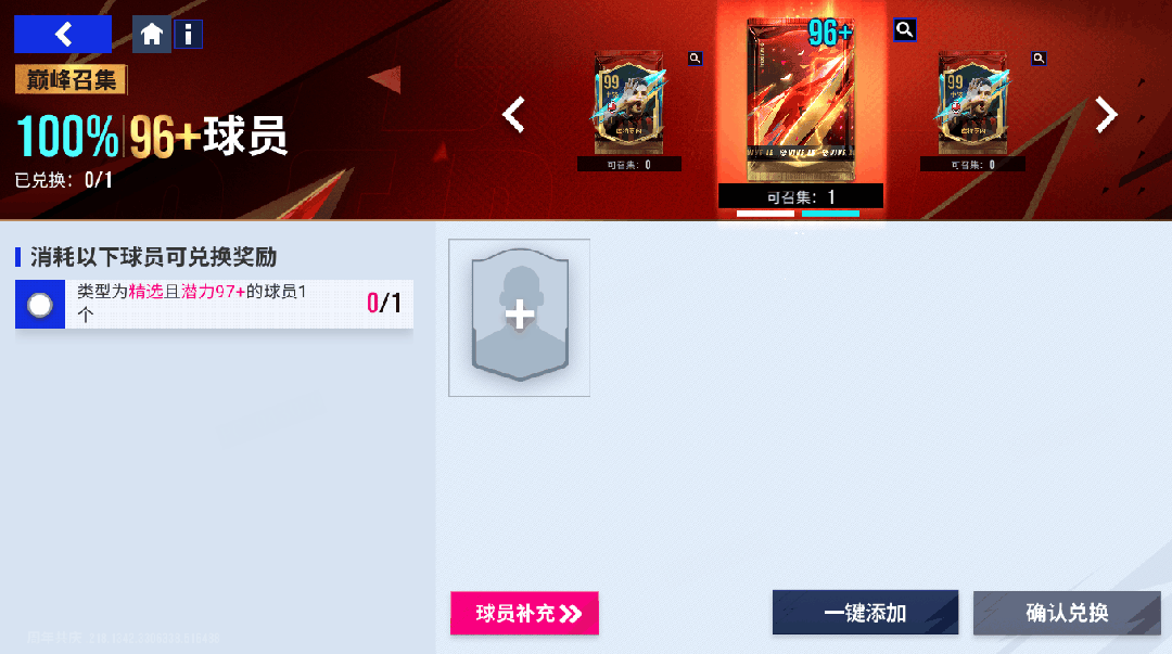 【96+欧洲风云球员包】阵容召集挑战将于12月12日11时至12月19日11时开启,活动期间每日可进行1次召集挑战,按条件使用1个97+精选球员进行召集,有机会获得【96+巅峰或精选球员】,最高可得【99巅峰球员】。