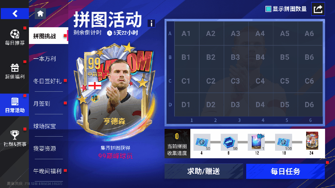 【拼图挑战】集齐24块拼图碎片,即可领取99巅峰球员【亨德森】,玩家可通过每日任务与好友交换获取拼图碎片。