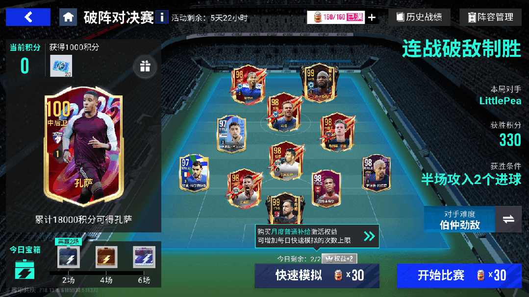 【破阵对决赛】12月12日11时至12月19日11时开启!玩家可以连续挑战随机对手,每次遭遇的对手阵容都是真实玩家的镜像阵容,获胜之后可以获取积分,累计积分必得100精选孔萨!同时每日完成一定次数的挑战还能获得每日活跃宝箱。