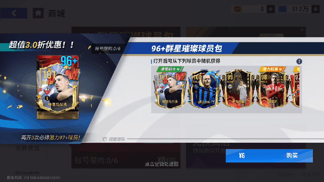 12月12日11时-12月19日11时期间,可在商场购买【96+群星璀璨球员包】,账号限购6次。打开后可获得96-101潜力球员,打开3次必出97+,更有机会获得【101巅峰格里马尔多】!