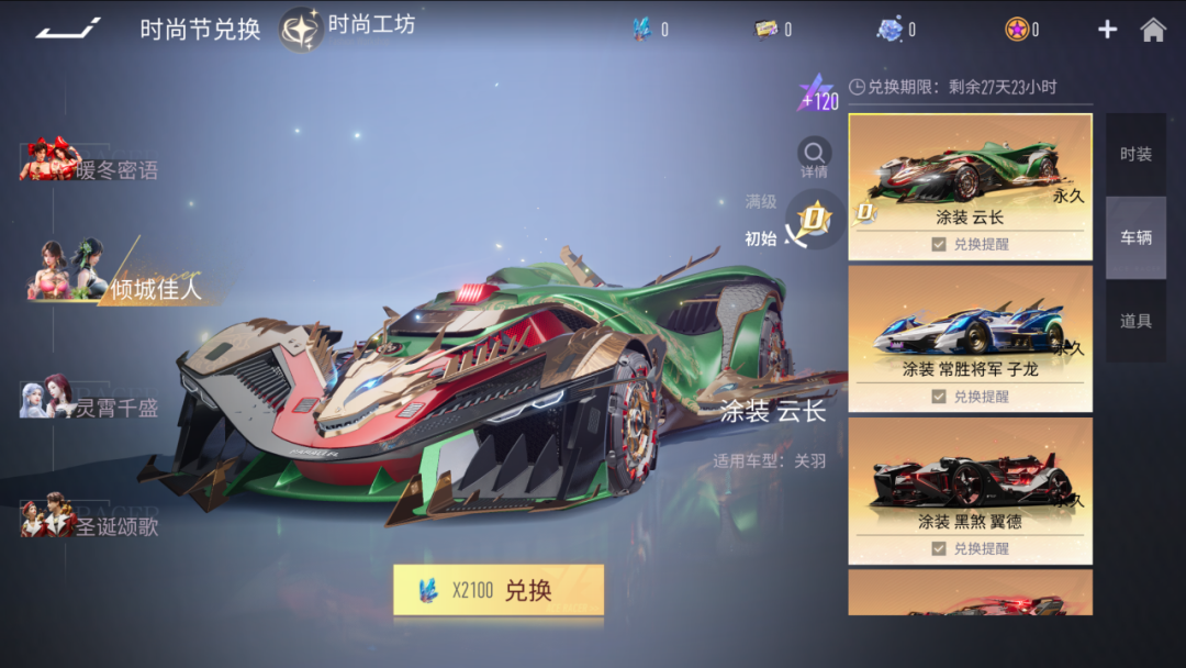 在本期时尚节兑换商店中,『可升级涂装-云长』、『常胜将军 子龙』、『黑煞 翼德』、『镇北将军 文长』、『个性喷口-武圣』&『个性喷口-云长』也将与车手们再度见面,以精细的重工改装构建复古超现实的潮流盛宴,喜欢的车手们这次别再错过啦!