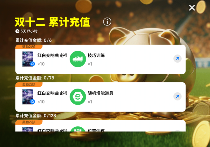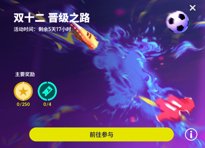 【双十二 晋级之路】设置有多个章节与多场比赛。你需要率领球队力克强敌,完成挑战,才能获得最终的丰厚奖励!