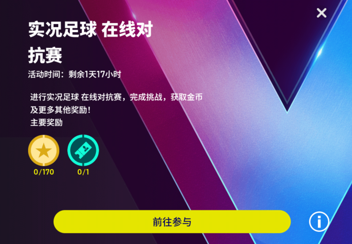 参与并完成【实况足球 在线对抗赛】,你将赢得【金币】和【高光定向券】作为参赛奖励。快来参加这场激烈的对抗吧!