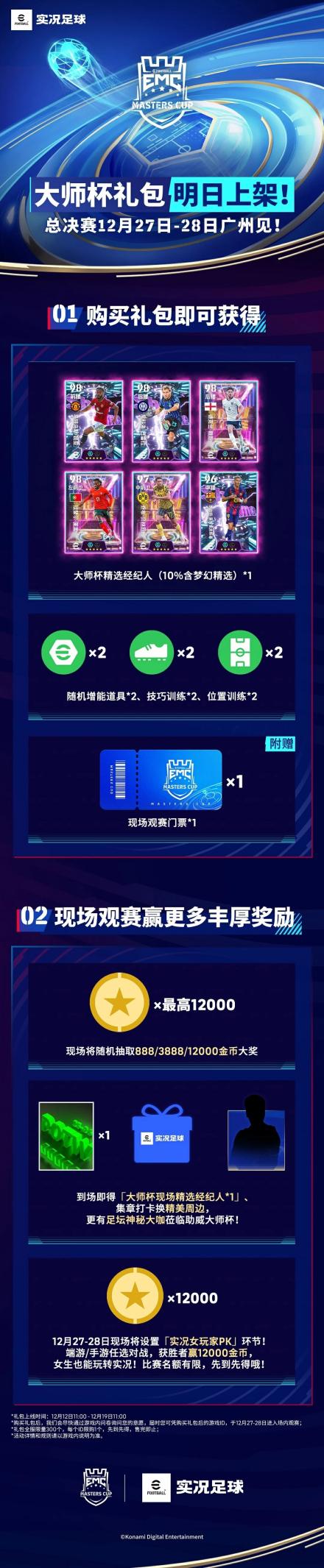 2025实况足球大师杯线下总决赛将于12月27~28日正式开战!购买【大师杯礼包】,不仅可获得【大师杯精选经纪人(10%含梦幻精选)】、技巧训练*2、随机增能道具*2、位置训练*2,还可获赠线下观赛门票。线下决赛当天抵达现场,凭门票可获得大师杯现场精选球员*1,还有金币抽奖活动与精美周边等你亲临体验。