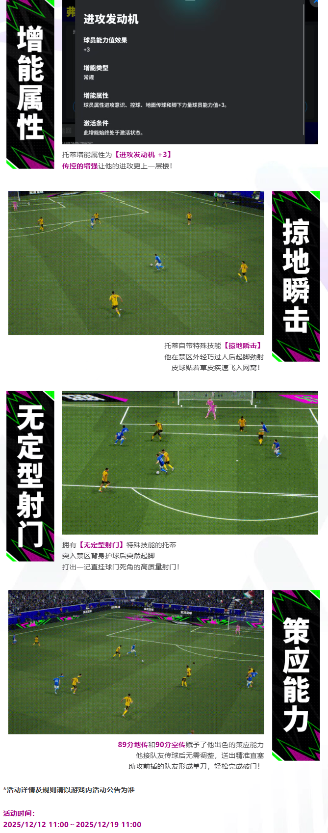 双增能史诗高光托蒂、鲁伊·科斯塔、范尼斯特鲁伊将通过【群雄逐鹿 高光 特级经纪人(1.5倍不重复高光)】首次登场!除此之外,你还将有机会获得双增能史诗高光马克莱莱、里杰卡尔德、巴蒂斯图塔、阿比亚蒂。想要补强球队的玩家们,千万不要错过此次活动!