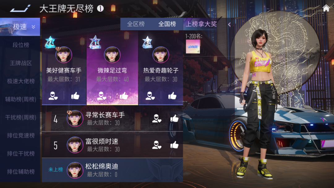 本次大王牌无尽榜分为全区榜&全国榜,最终两个榜单排名前200的车手可以获得限时称号奖励!