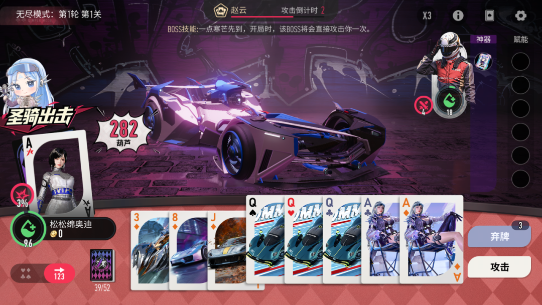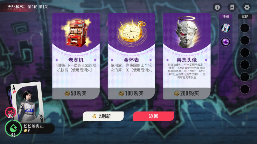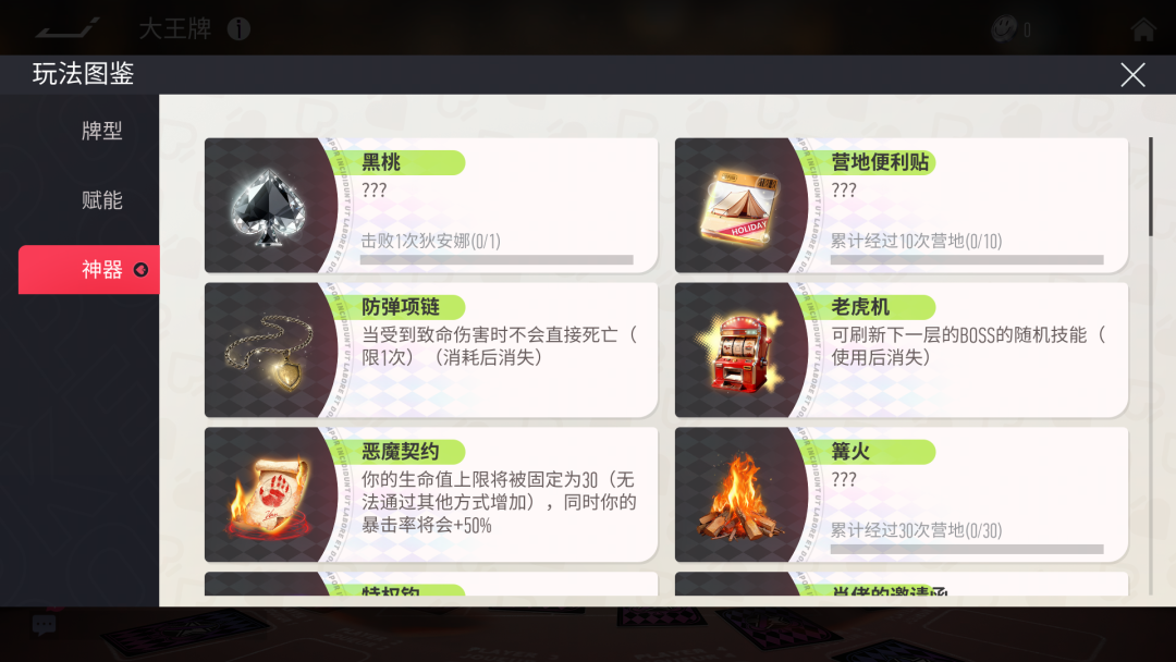 在无尽模式中,圣骑士车姬将作为发牌员为你助阵,同时神器商店将向你开放,每件神器都能触发不同的强力效果。处于地图界面时可随时点击右上角打开神器商店购买神器。