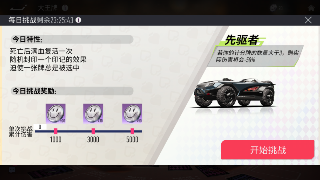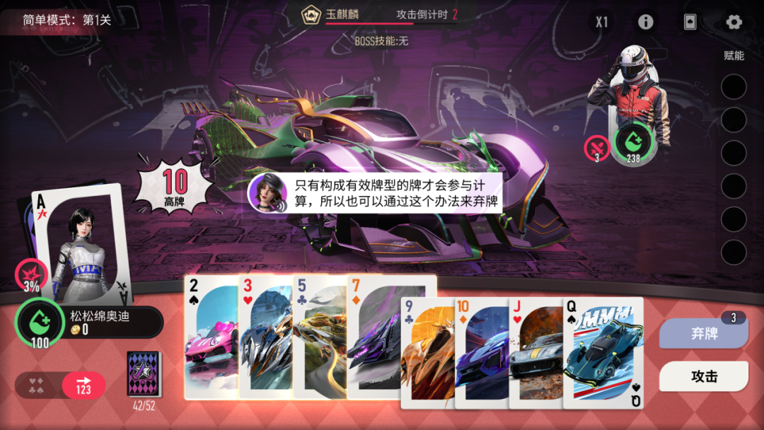 大王牌2.0的基础规则与此前相同,游戏开始后将随机生成一张地图,地图中存在不同节点,车手们需要利用手中现有卡牌组成并打出不同的特殊组合对BOSS造成伤害,击败最终BOSS即视为挑战成功,自身血量为0时将视为挑战失败并结束游戏。