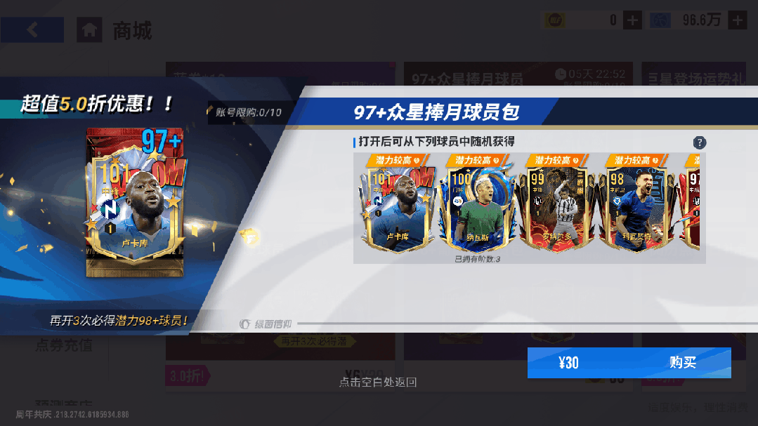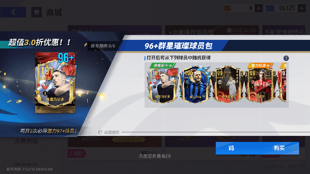12月19日11时-12月26日11时期间,可在商场购买【96+群星璀璨球员包】,账号限购6次。打开后可获得96-101潜力球员,打开3次必出97+,更有机会获得【101巅峰格里马尔多】!