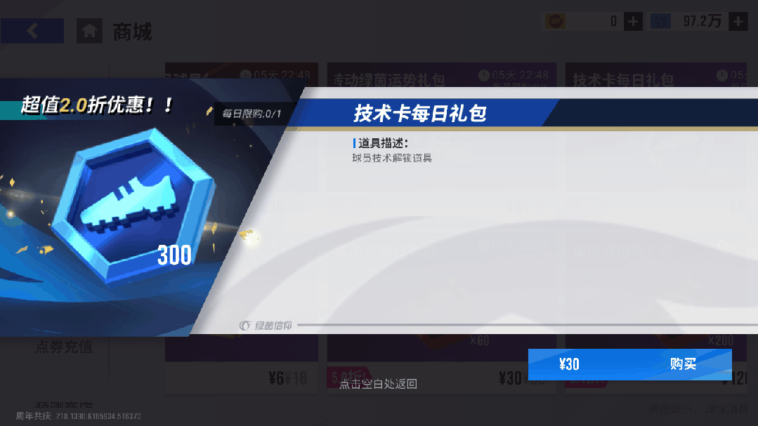 12月19日11时-12月26日11时期间,可在商场购买【技术卡每日礼包】,每日限购1次,购买可获得技术卡*300,仅需30元!