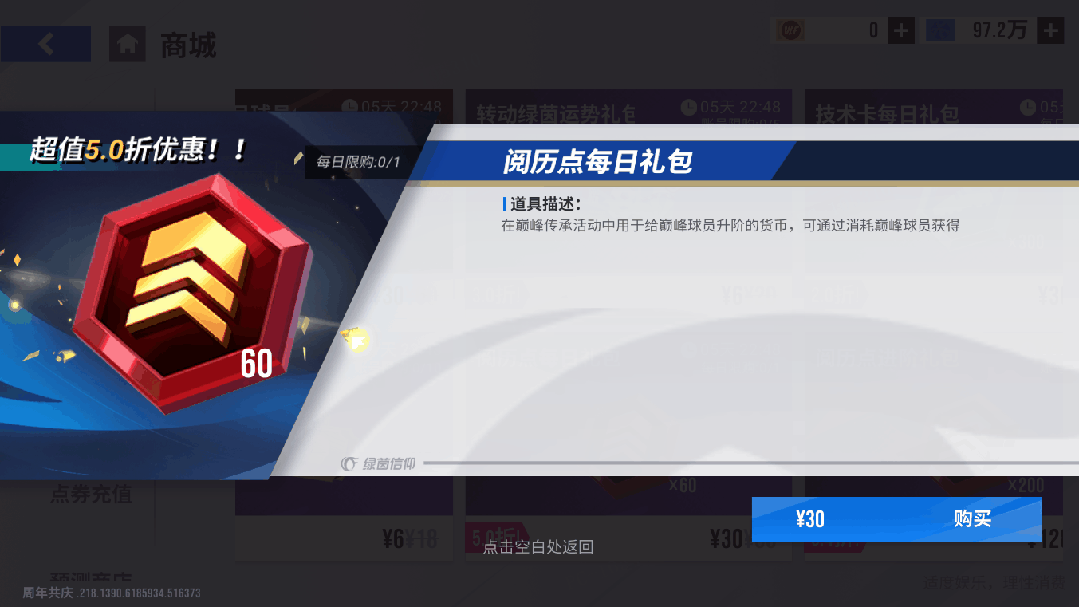 12月19日11时-12月26日11时期间,可在商场购买【阅历点每日礼包】,每日限购1次,购买可获得阅历点*60,仅需30元!