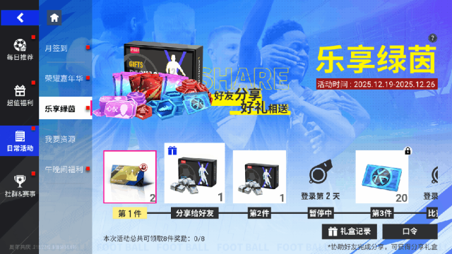 12月19日11时-12月26日11时期间,签到分享领好礼、分享也可获得「分享礼盒」奖励!