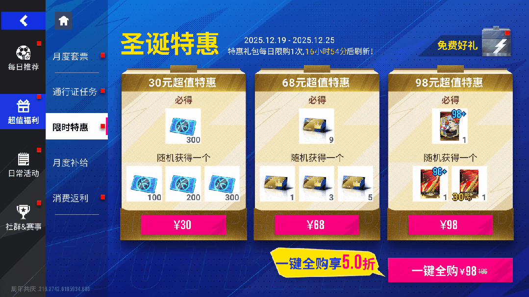12月19日11时-12月26日期间,【圣诞特惠礼包】惊喜上线!每日登录可以以优惠的价格购买「98+巅峰球星包」「登场券」等特惠商品,一次性打包购买更可享超值折扣!