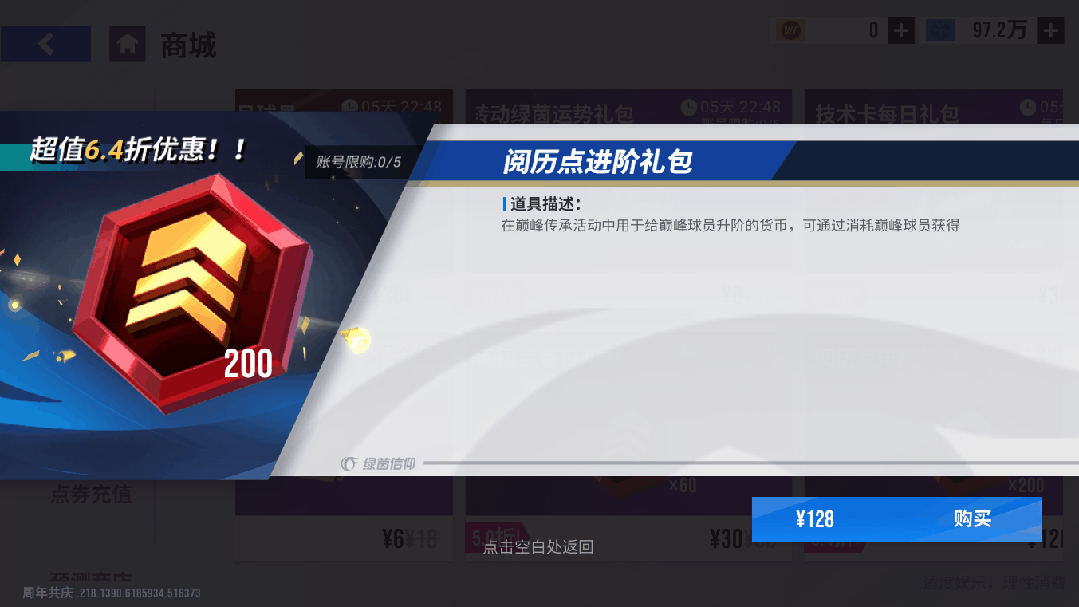 12月19日11时-12月26日11时期间,可在商场购买【阅历点进阶礼包】,账号限购5次,购买可获得阅历点*200,仅需128元!
