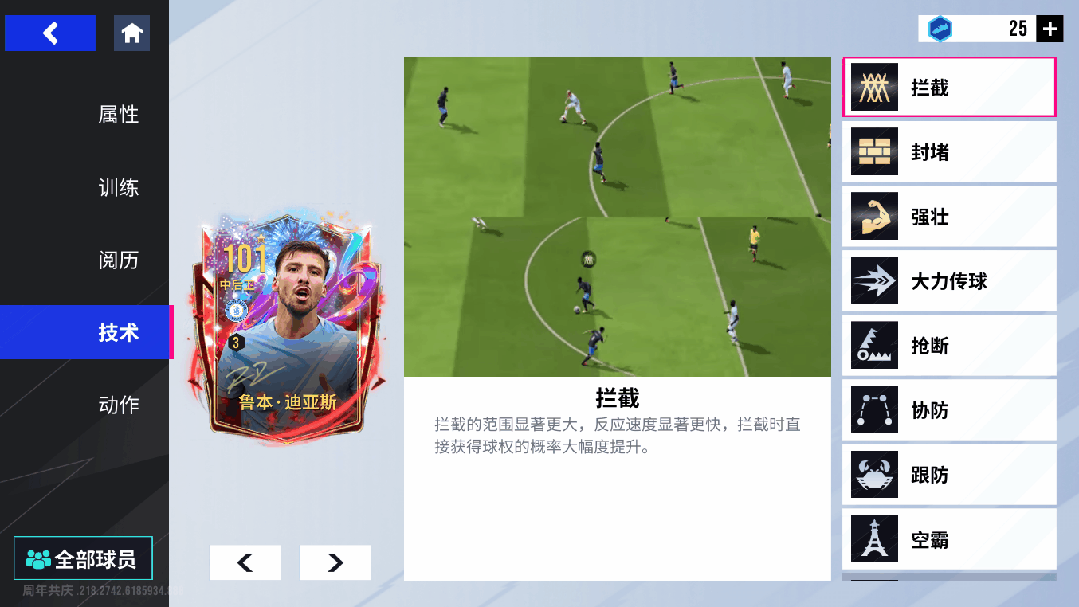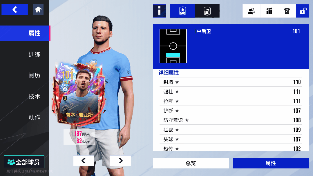 这张101巅峰鲁本·迪亚斯搭载了金色【拦截】技术和金色【封堵】技术,配合出色防守属性,让他能在关键时刻精准预判对手的进攻路线,在防守端如铜墙铁壁,无论是单防还是协防都能游刃有余,轻松化解对方的威胁之势,诠释了何为后防铁闸!而作为后防核心,鲁本·迪亚斯不仅防守能力出众,还具备出色的出球能力。【大力传球】技术使他能在后场从容组织进攻,精准找到前场队友,发起快速反击。此外,【空霸】技术,配合107的头球属性,让他在定位球进攻中成为不可忽视的威胁,经常通过头球为球队打开局面。而金色【强壮】技术配合111的强壮属性,则让他在防守端的身体对抗不落下风,在一对一的情况下能够身体抗开进攻队员,夺下球权。
