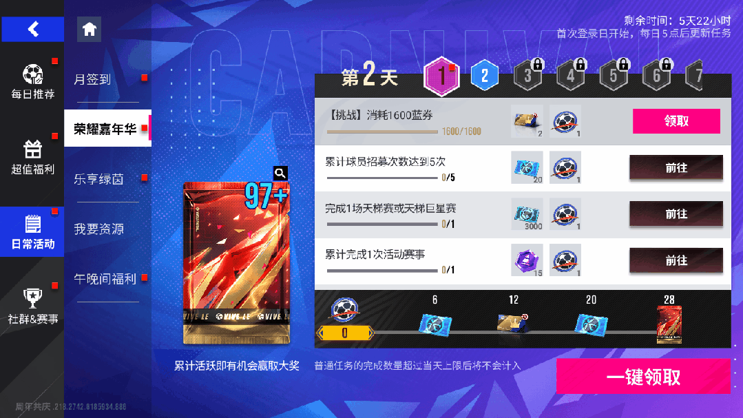 12月19日11时-12月26日11时期间,玩家每日完成活跃任务,即可领取大量道具奖励包括「巨星登场券(限时)」、「动作卡」、「蓝券」等,更可获得「97+巅峰球员包」!