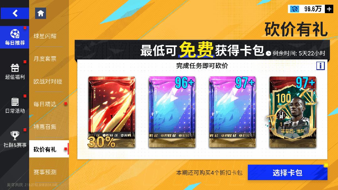 12月19日11时-12月26日11时期间,玩家完成指定任务即可获得砍价资格进行砍价,最低可免费获得「30%保金巅峰包」,更有精选及巅峰球员包折扣购买!