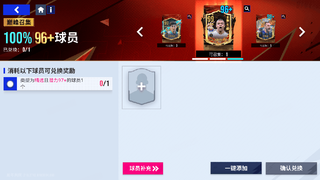 【96+欧洲风云球员包】阵容召集挑战将于2025年12月19日11时至2026年1月2日11时开启,活动期间每日可进行1次召集挑战,按条件使用1个97+精选球员进行召集,有机会获得【96+巅峰或精选球员】,最高可得【99巅峰球员】。