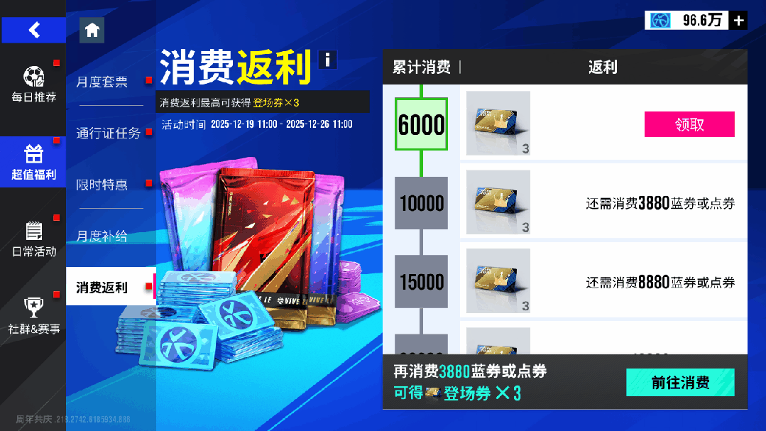 12月19日11时-12月26日11时期间,玩家活动期间内,消耗蓝券达到一定目标即可获得丰厚奖励,消费越多获取奖励越多!