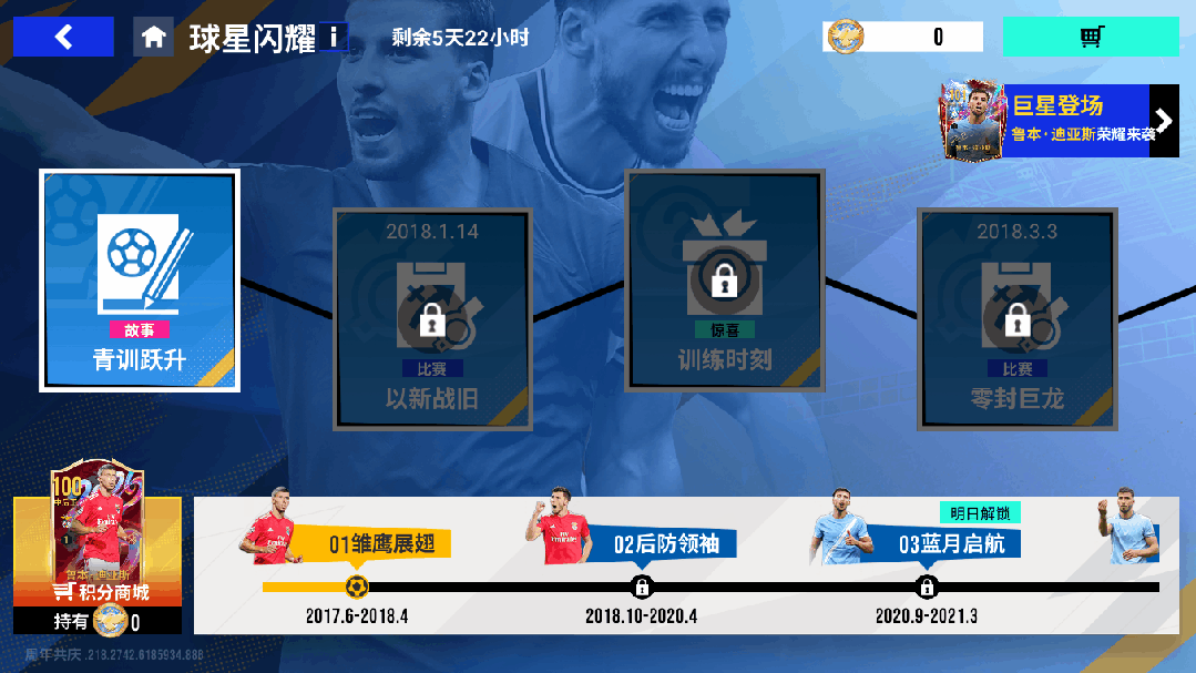 12月19日11时-12月26日11时期间,将开启巨星登场-101巅峰鲁本·迪亚斯 ,每次开启都有概率获得巨星积分!可通过巨星积分兑换101潜力巅峰球员鲁本·迪亚斯、99潜力巅峰球员奥尔特加、99潜力精选球员里科·刘易斯,更可获得进度奖励「96+蓝月精选球员包」「97+蓝月球星包」「98+蓝月球星包」「30%保金精选包」等奖励!