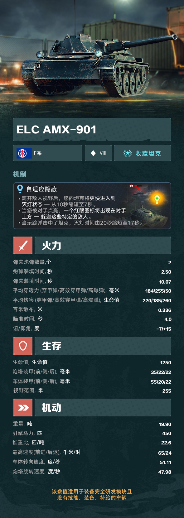 同样的,VIII级ELC AMX-901的装甲与生存能力相对比较薄弱,极其考验车长的意识与耐心。熟练地驾驶它,成为主宰视野、伺机给予敌方重击的战场幽灵!