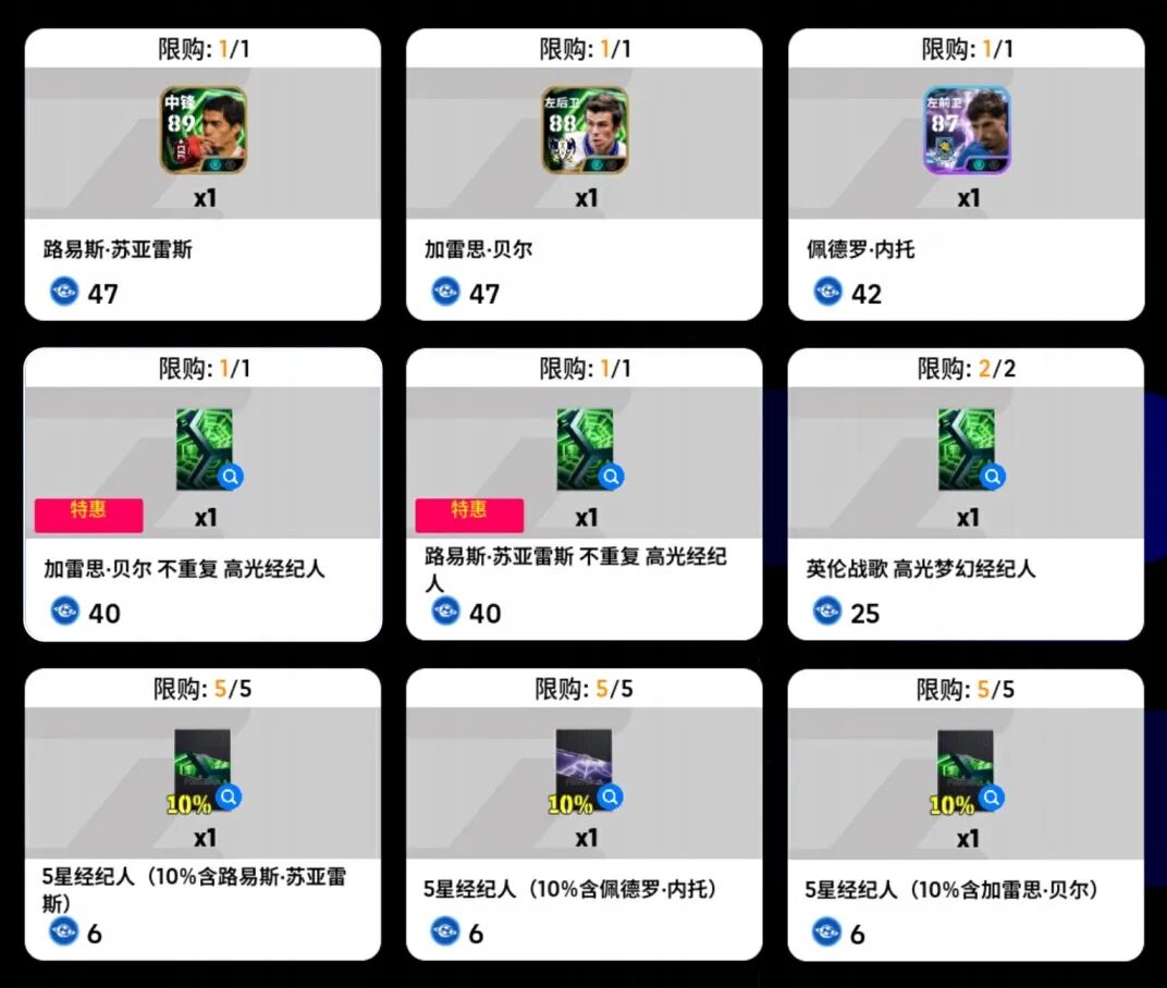 *除此之外,玩家还可以使用【战歌徽章】特惠兑换【苏亚雷斯 不重复 高光经纪人】或【贝尔 不重复 高光经纪人】。如果你已拥有双增能决胜高光苏亚雷斯或双增能决胜高光贝尔,即可使用更少徽章兑换对应球员的新版双增能史诗高光卡!