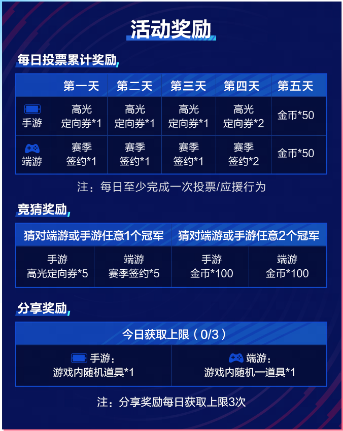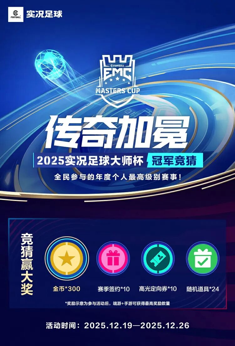 助威大师杯,上场即大师!【实况足球大师杯冠军竞猜活动】活动期间您可多次助威喜爱的选手,助威后可获得【高光定向券】*5、【金币】*50等其它道具奖励。猜中手游或端游任意一个冠军选手,可获得【高光定向券】*5奖励,若同时猜中手游和端游的冠军选手,还将获得【金币】*100奖励!