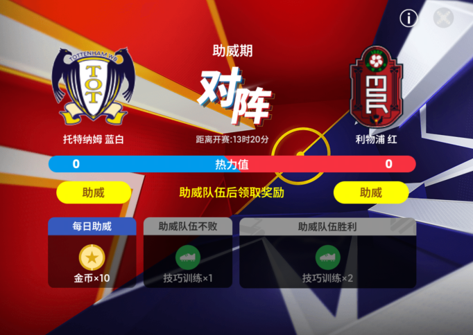 在【英伦战歌 球队助威】活动中,玩家可以从【托特纳姆 蓝白 VS 利物浦 红】中选择你助威的球队,参与助威即可获得【金币】奖励,预测成功将获得【技巧训练】。