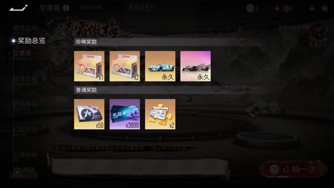 12月26日,至尊阁-凌霜傲梅正式开启,车手们使用道具-至尊符(可使用绑币购买)即可参与抽奖,每次抽取必得奖励,抽取7次必定获得全部奖励,活动抽奖消耗的道具数量会随抽奖次数的增加而增加。