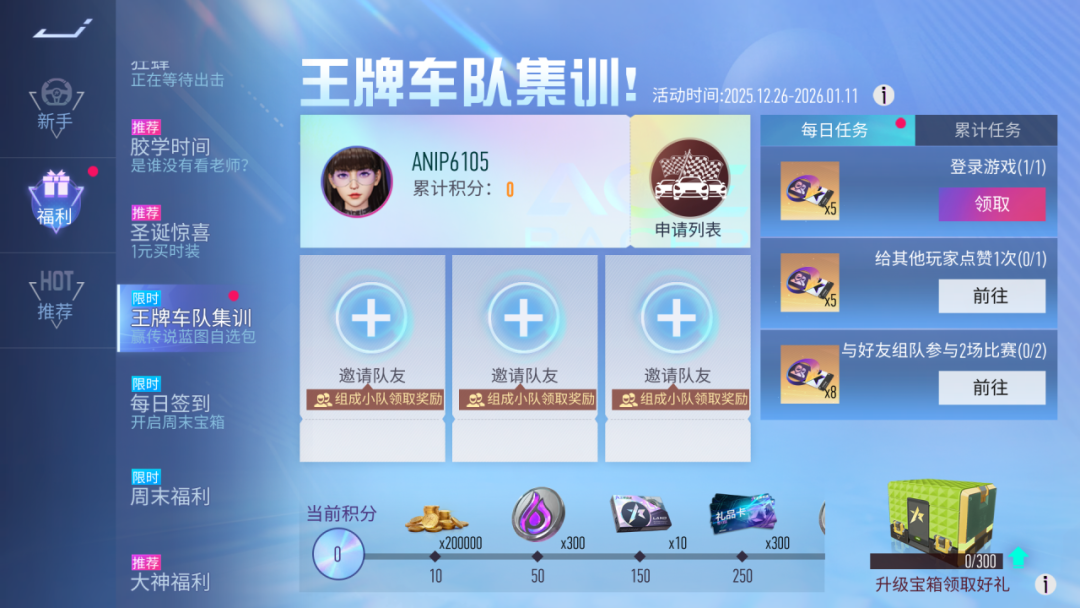 赢传说蓝图自选包!12月26日~2026年1月11日,王牌车队集训限时开启,与好友一起组成小队,完成任务可积攒小队积分。累计小队积分可获得万能零件、III级芯片礼包等道具奖励!训练活跃的小队更有机会解锁额外大奖,赢取传说蓝图自选包等稀有奖励。快召集王牌车手们一起训练吧!